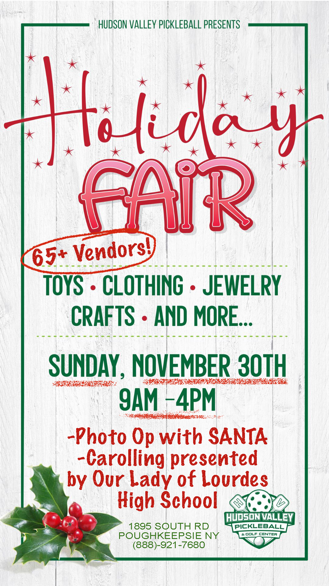 Holiday Fair at Hudson Valley Pickleball 65+ LOCAL ARTISTS & VENDORS!! Photo-op with SANTA 12-2PM: Caroling by Our Lady of Lourdes High School Sunday, Nov 30th 9AM – 4PM 1895 South… |